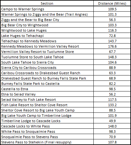 Below is a list of all the resupply points that I plan on using along with the distance in between each of those resupply points. Some of these locations are right on the trail while others I will have to hike or hitchhike up to 12 extra miles to get my supplies.