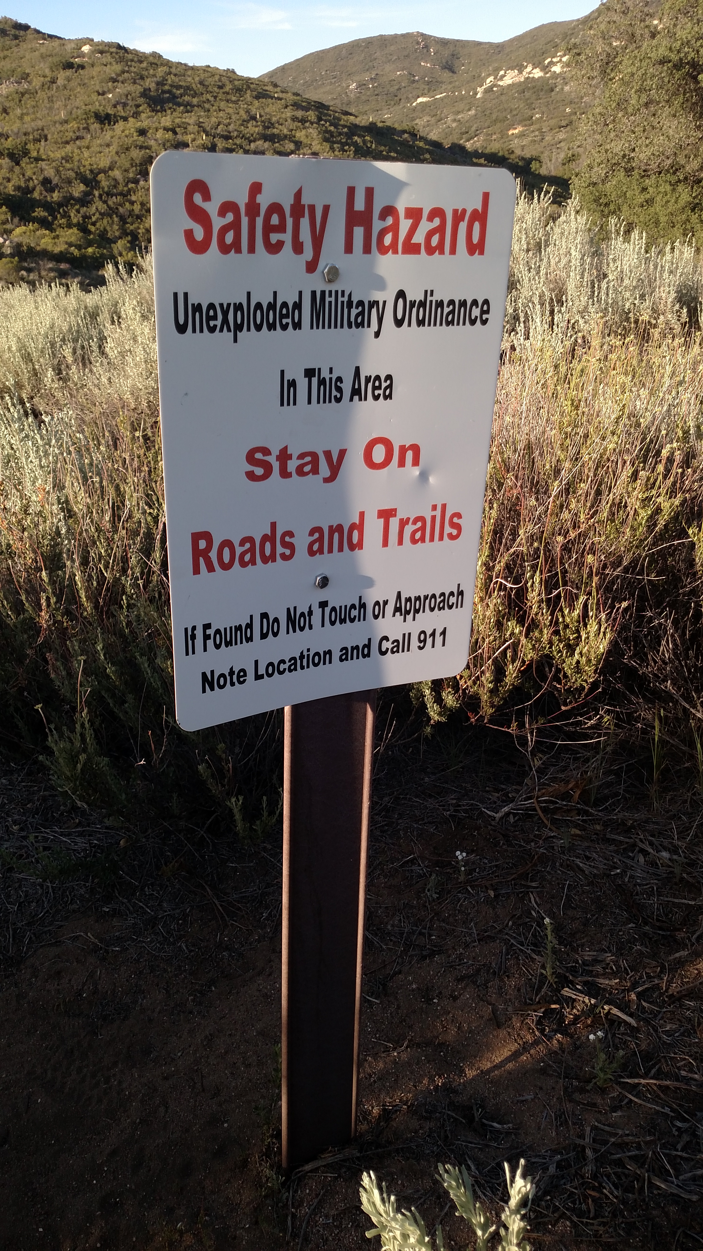 According to my map: “In May 2009 a Marine Super Cobra attack helicopter crashed near PCT mile 32.6. Munitions carried by the helicopter were scattered as a result of the crash. Signs warn hikers to stay on trail because of a safety hazard from unexploded military ordinances in this area.”