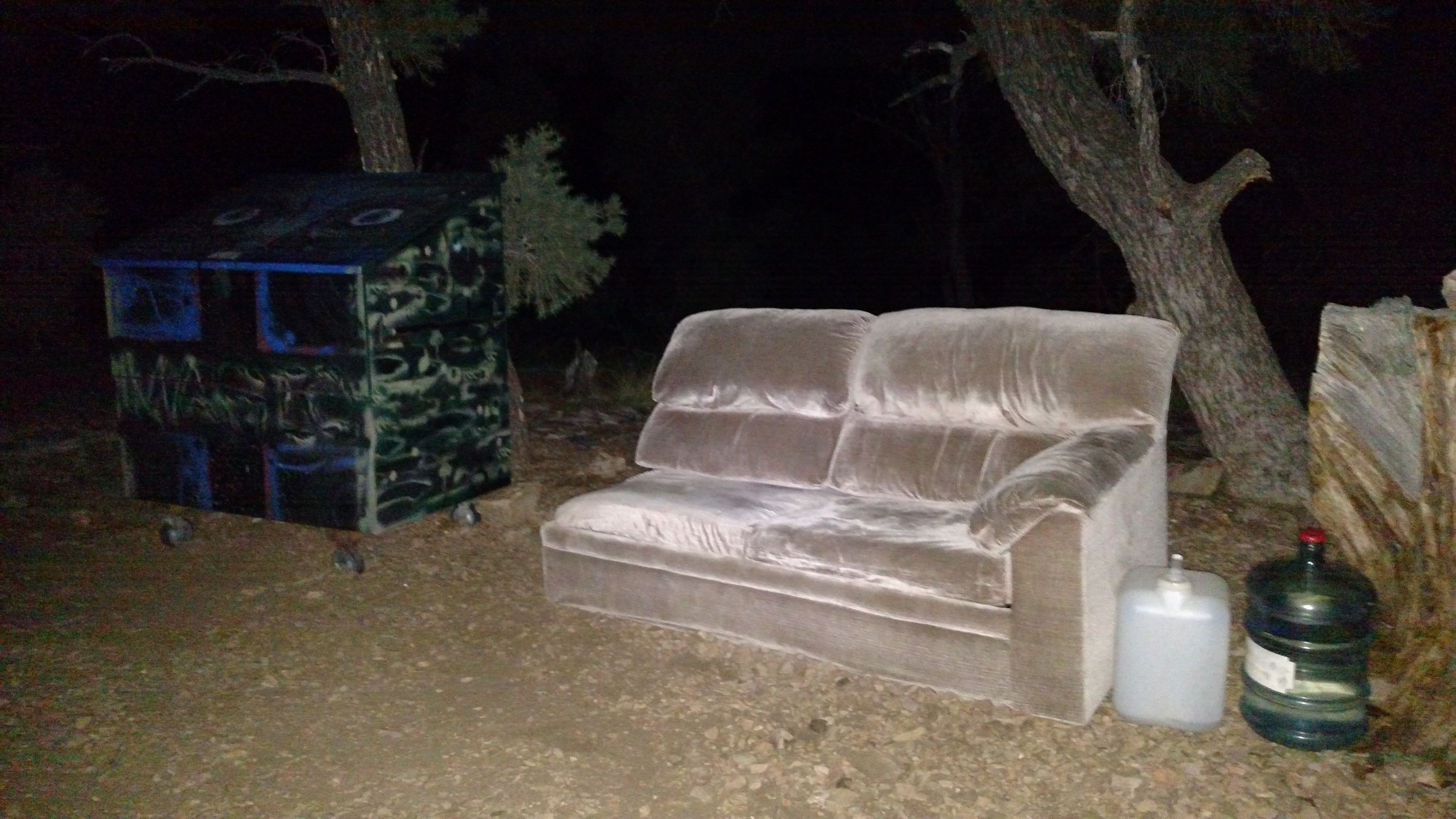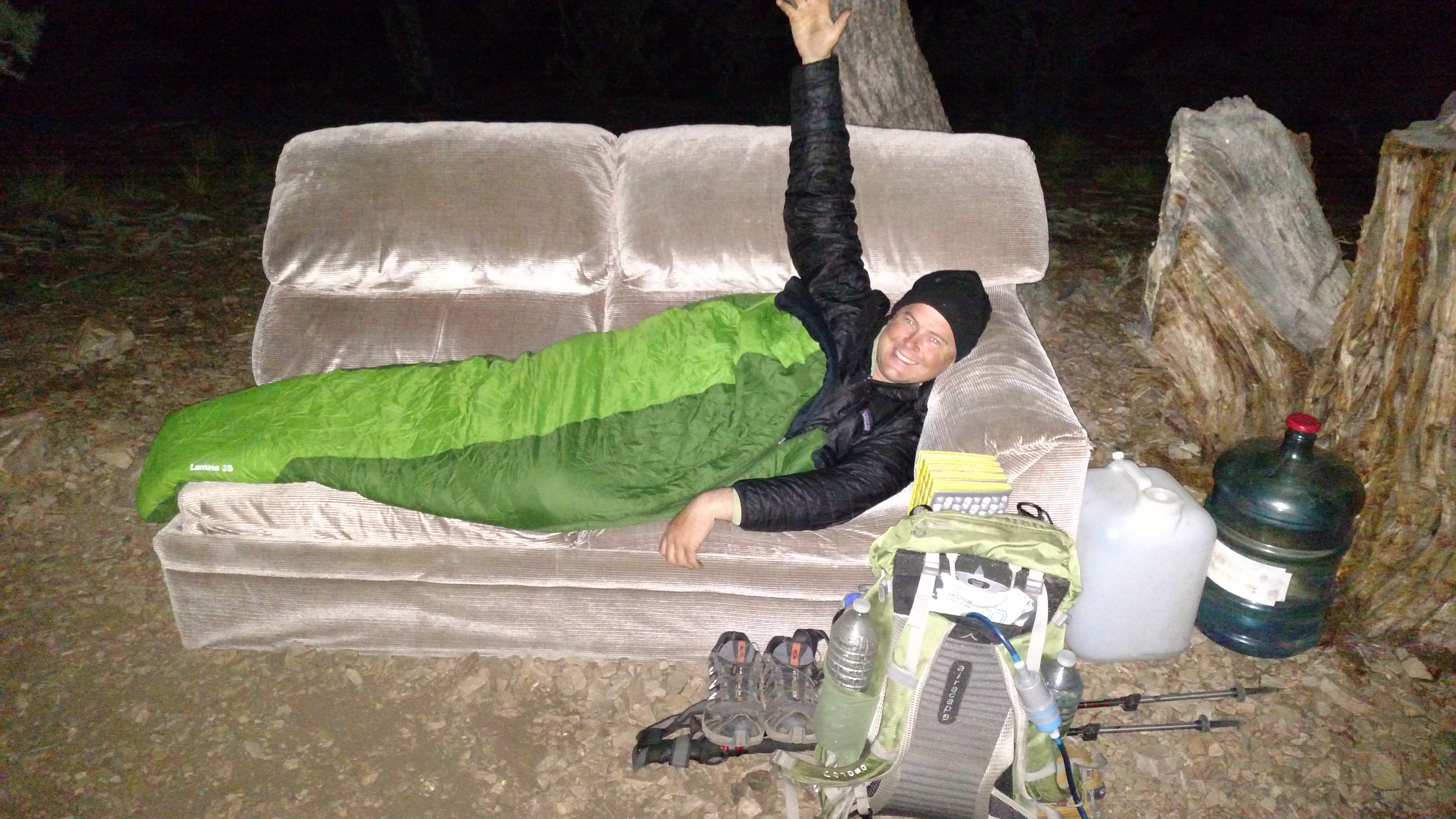 Woke up with the goal of hitting 24 miles. Nothing was to special or different today as I just kept hiking. I expected to hike for a couple hours in the dark to make the miles I needed to get me closer to Big Bear Lake. As I hit 18 miles, it had just gotten dark and I was still in trees for the most part which meant the moonlight wasn’t going to assist me tonight. I turned on my headlamp and marched on. After three miles of hiking I was shocked to see a couch sitting on the side of the trail next to a dumpster. I slowly opened the dumpster and saw a register book along with drinks and snacks for those who needed them along with information of Big Bear Lake.