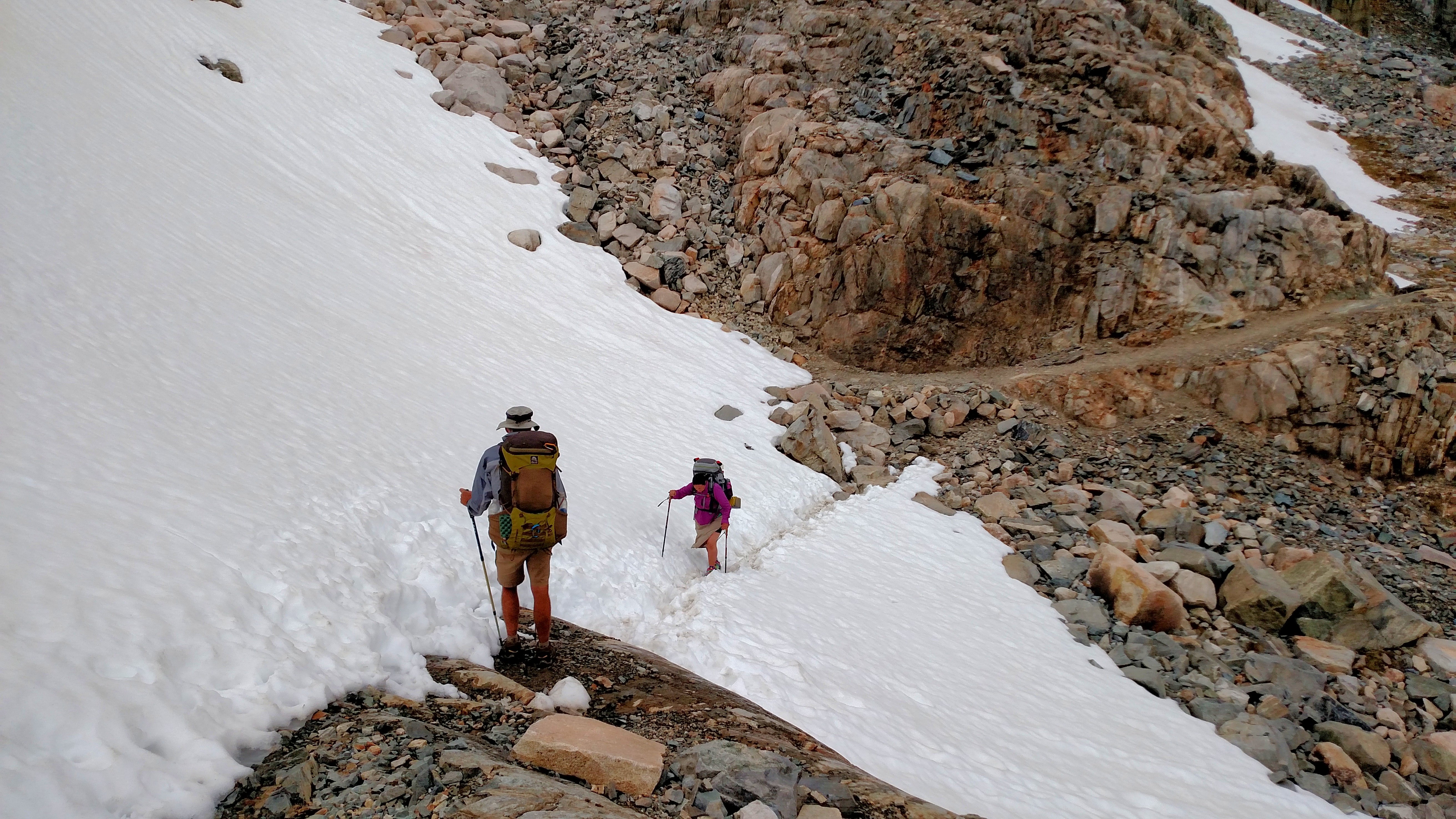 I slept good last night, unfortunately my shoes didn’t really dry out much. I decided to take two Ziploc bags and cut them so my feet could fit in them the best way possible and then slipped on my shoes. Hopefully this will keep my feet from getting wet and cold. I left at the first sign of any light. I wanted to get an early start so I could walk across the frozen snow and not sink down. This worked out greatly for me as I had zero problems walking the next few miles down the pass on top of the snow.