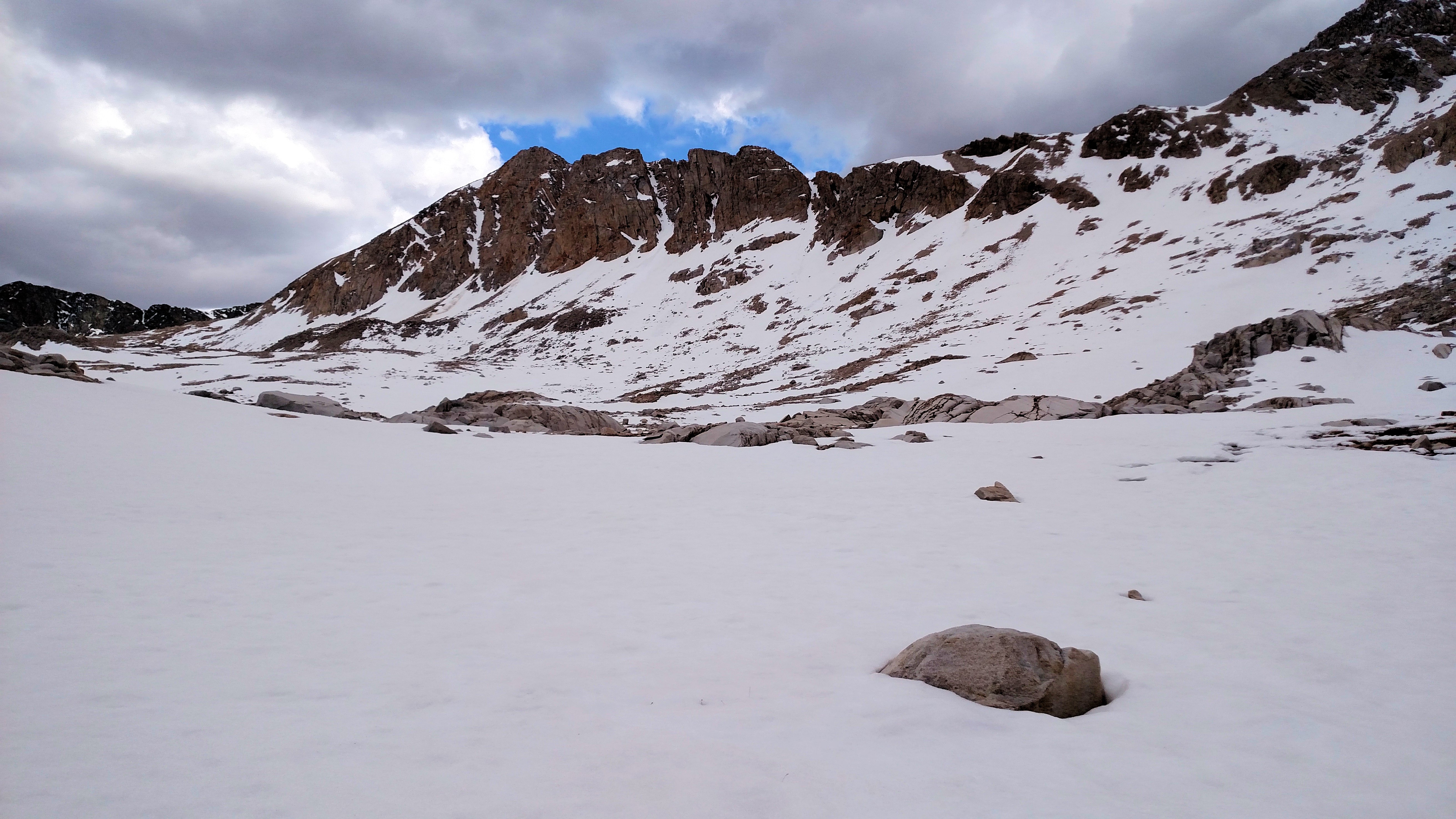 Forrest was looking to get to a lake just before Muir Pass where someone was going to meet him. When we reached the frozen lake, I was surprised to see Steady was the person he was trying to meet up with. It was great to talk to her for a bit, but I was in a hurry to get up to Muir Pass and determined to make it to the top and maybe further. I looked up at the top in the general direction I was supposed to go, but with no trail, it will be interesting. With one mile to go, I started walking and it was a slow walk as I sunk deep in the snow with every step I took. I could hear water running under the snow all over and got to a point where I realized I’m going to get real wet and there is nothing I can do about it. Some areas I would sink up to almost my waste and in other spots where the water was running, the snow wasn’t as deep but I would step in anywhere from three to six inches of freezing cold water. It was slow going but I finally made it to the top and saw Muir Pass hut.