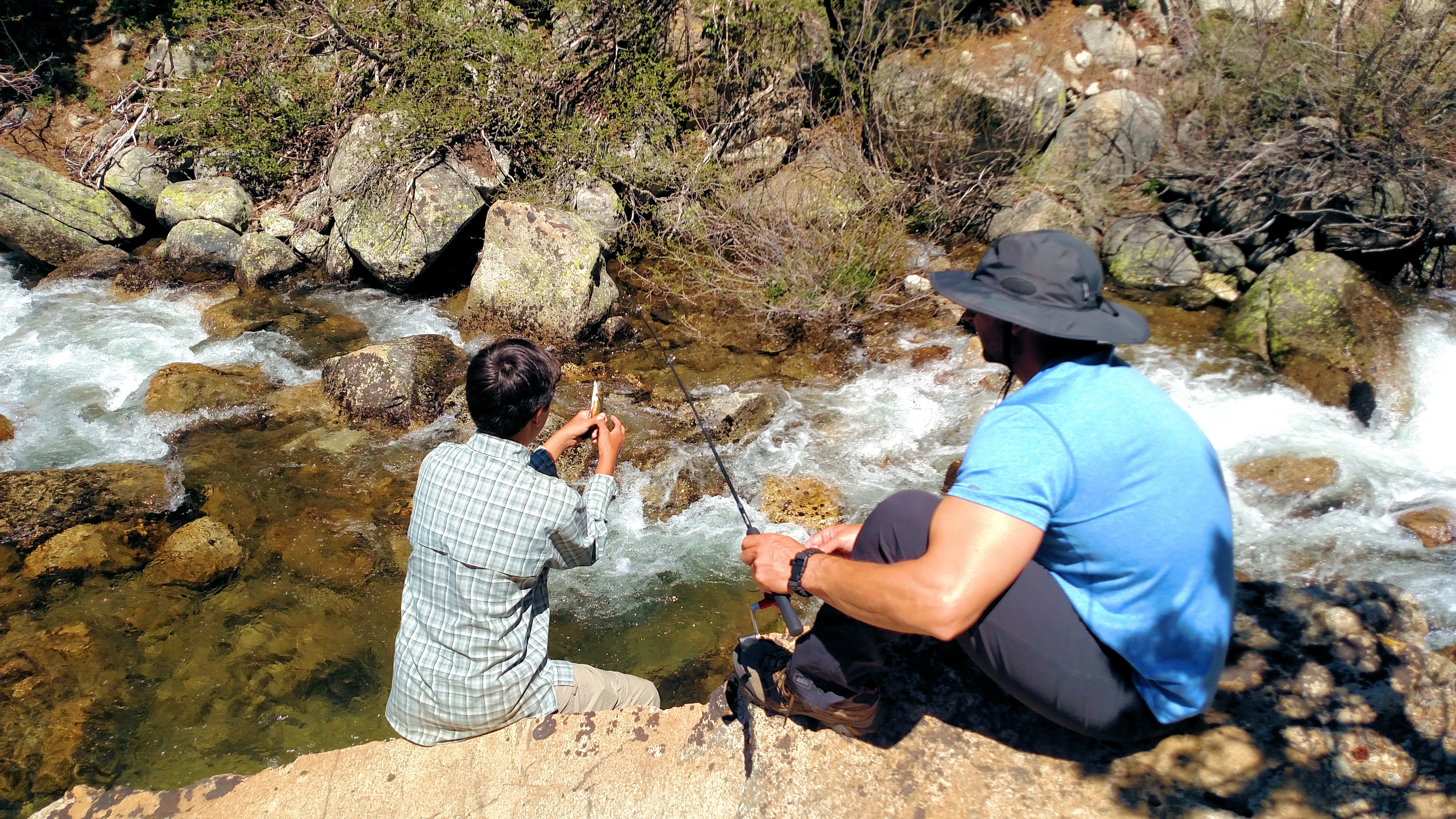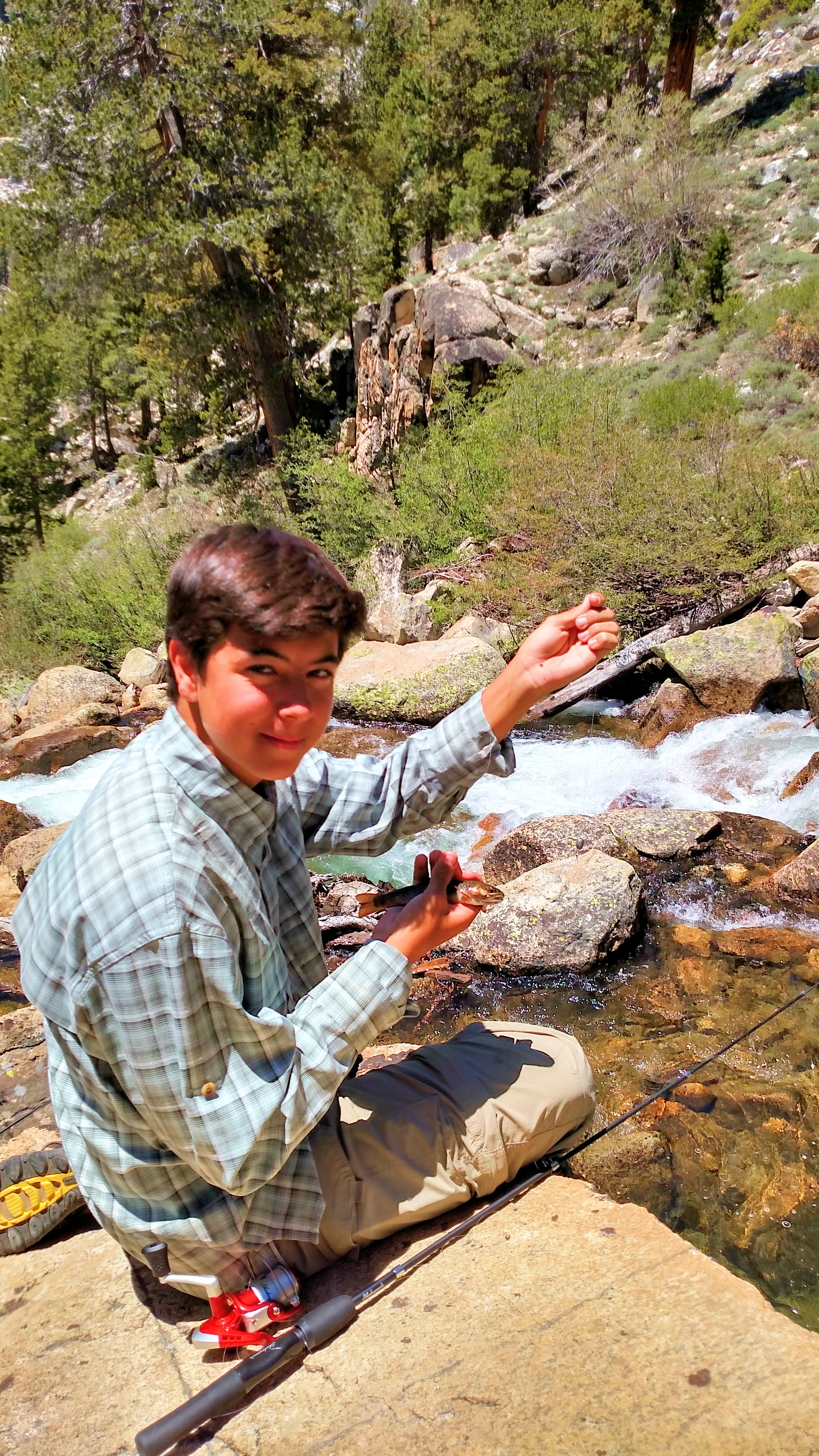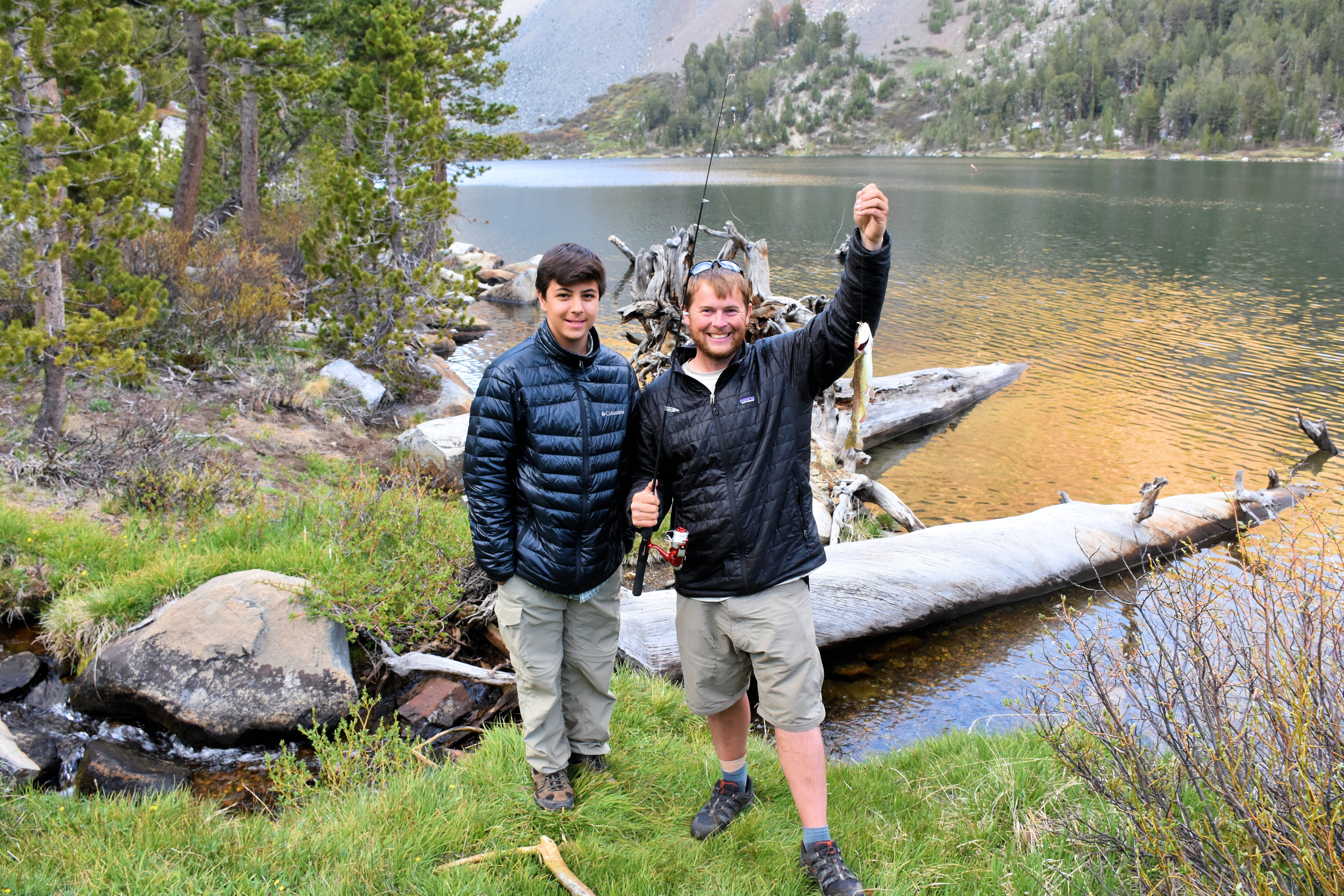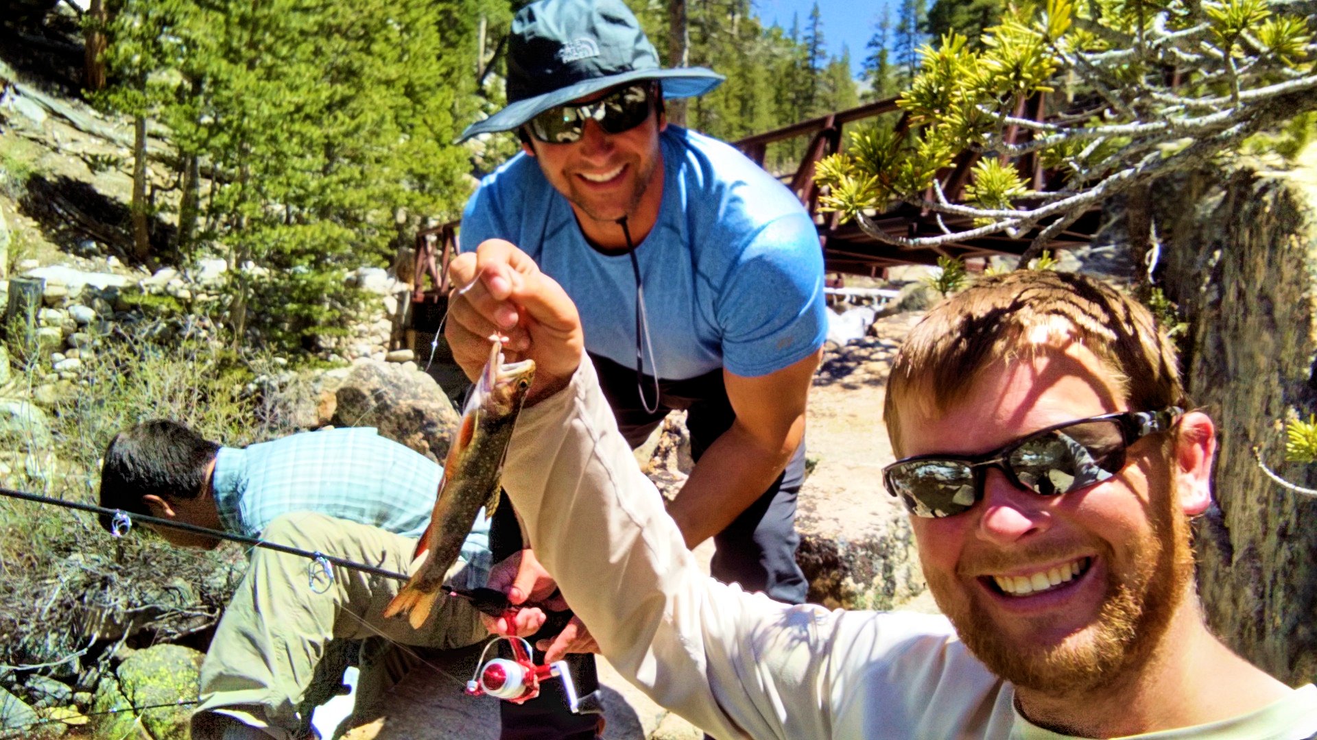 We hiked in four miles where we stopped at Fish Creek for breakfast. It wasn’t long before Casper showed up and took a break with us. I haven’t seen him since I left Muir Pass. Casper pointed out that there were some fish swimming down in the creek. Jason and Blane had their fishing poles and we decided to set them up and see if we could catch anything. Blane has never caught a fish before and at first, he wasn’t to big on the idea at first but was still willing to give it a shot. I helped set up the poles using a fly that they had. It did not take long before I had my first fish on the line. Nothing huge, but it was fun catching a fish on the PCT!