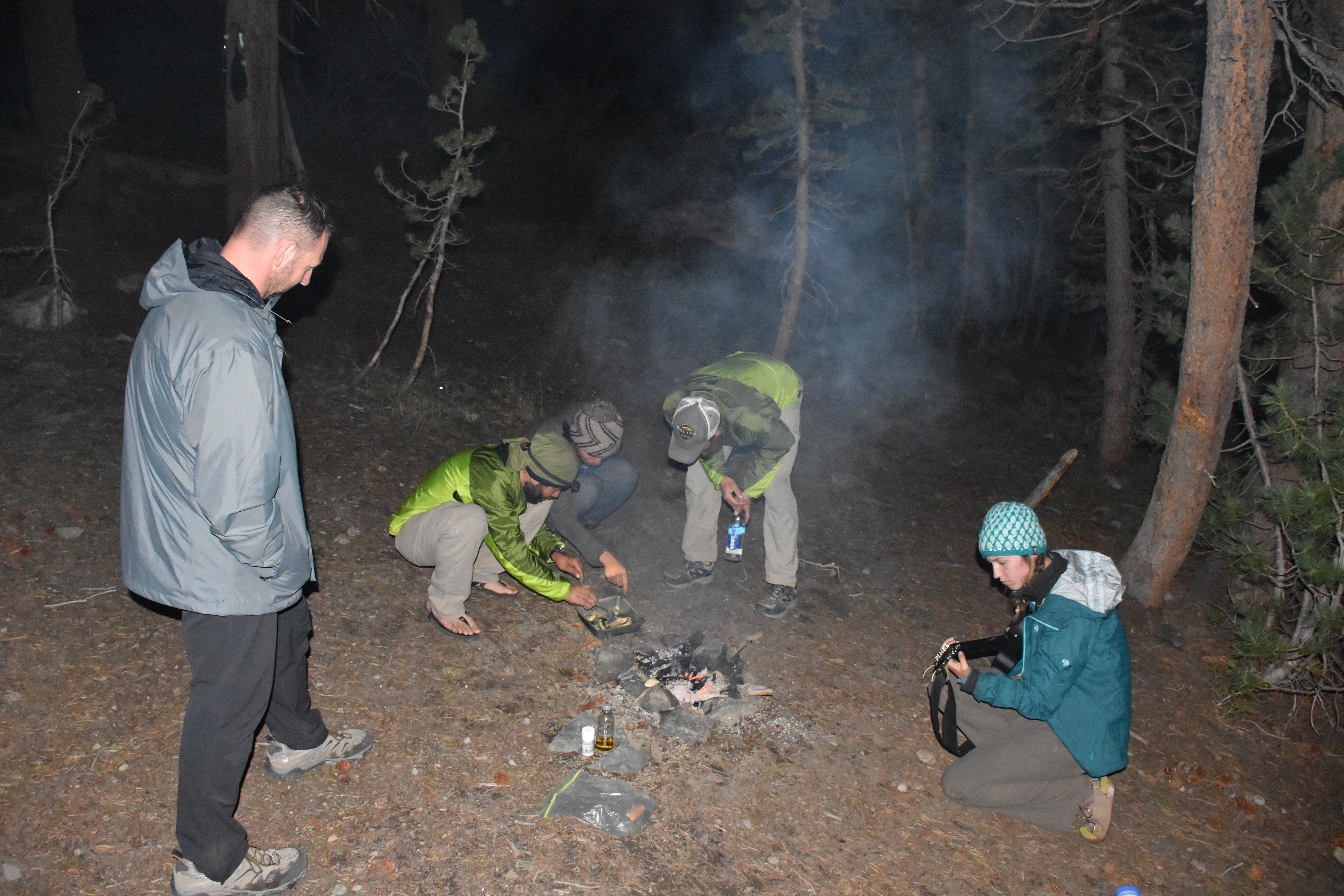 Bearly got a fire going and built up some hot coals so we could cook the fish. We put the fish in a pan and cooked the fish using some oil, salt and honey that some of the hikers had. Too Shy started to play the guitar as the sun went down and darkness came. Bearly pulled out a harmonica and played along with Too Shy. It was nice to sit around a fire and cook a fresh meal that we caught out of the lake while listening to music. A perfect night indeed. Once the fish was done, we tried it and it was perfect. We all just dug in and grabbed some fish and had to deal with plenty of fish bones, but was worth it. Afterwards, it was time to put out the fire and get some sleep.